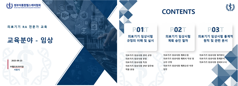 이번 교육은 의료기기 인허가(RA) 교육 수강생을 대상으로 마련된 자리로, 의료기기 임상시험 규정과 계획승인 절차, 통계적 원칙을 주제로 심도 있는 강의가 이루어졌다.
