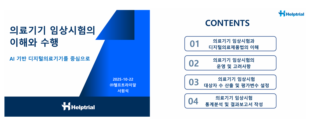 고려대학교 의과대학 의료정보학과는 2025년 10월 22일(수) 오후 2시부터 6시까지 성북구 정릉로 161 메디사이언스파크에서 대학원 정규강의의 특강으로 ‘의료기기 임상시험의 이해와 수행 – AI 기반 디지털의료기기를 중심으로’를 개최했다. 이번 특강은 고려대학교 의과대학 이화민 교수의 요청으로 인공지능 기반 디지털의료기기 임상 강의를 다수 진행해온 ㈜헬프트라이알 서원석 부장이 강연을 맡았으며, 대학원생들이 연구실 단계의 AI 모델을 실제 임상시험과 인허가 단계로 연결하는 데 필요한 실무 관점을 제공하는 데 초점을 맞췄다.