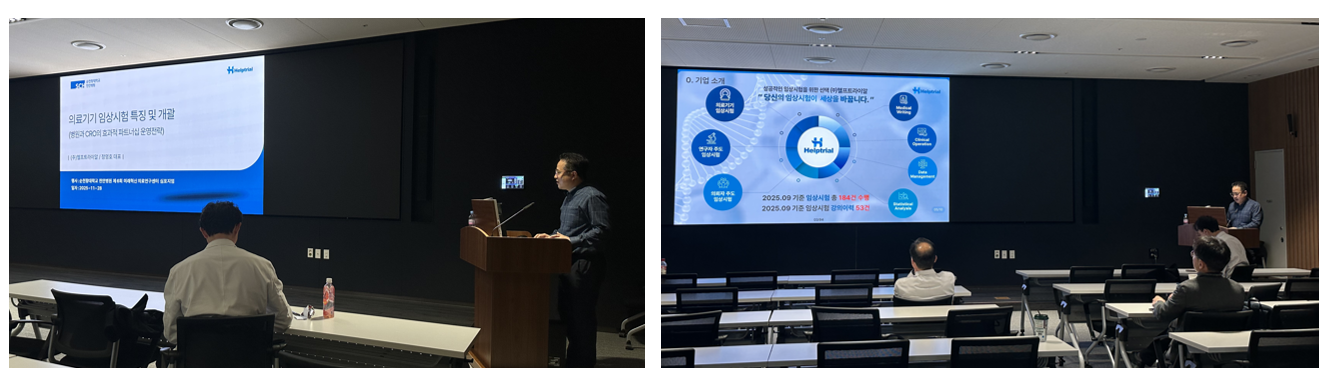 ㈜헬프트라이알 정영호 대표는 지난 11월 28일(금) 15시 50분부터 16시 30분까지 순천향대학교 천안병원 제1강당에서 열린 ‘제6회 미래혁신의료연구센터 심포지엄’에서 ‘의료기기 임상시험 특징 및 개괄 – 병원과 CRO의 효과적 파트너십 운영전략’을 주제로 강연을 진행했다. 이번 심포지엄에는 순천향대학교 천안병원 및 인근 의료기관의 의료진·연구자와 의료기기·디지털헬스케어 개발 기업 관계자 등이 참석했다.