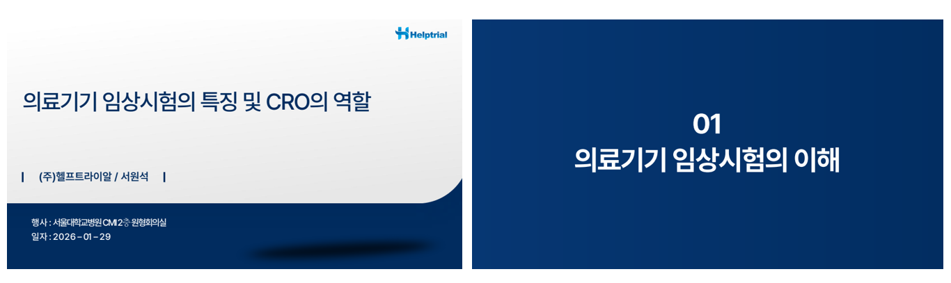 ㈜헬프트라이알은 2026년 1월 29일(목) 서울대학교병원 CMI(의학연구혁신센터) 2층 원형회의실에서 ‘의료기기 임상시험의 특징 및 CRO의 역할(AI 임상시험)’을 주제로 강의를 진행하며 2026년 강의 활동의 시작을 알렸다. 본 강의는 서원석 부장이 강연을 맡아 의료기기 및 AI 기반 의료기기 임상시험의 구조와 CRO의 역할을 중심으로 진행됐다.