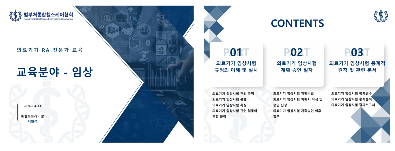 ㈜헬프트라이알은 2026년 4월 14일(화) 범부처통합헬스케어협회가 주최한 ‘의료기기 규제과학(RA) 교육’에서 임상 분야 강의를 진행했다. 이번 교육은 의료기기 인허가 및 규제 대응 역량 강화를 위한 RA(규제과학) 전문 교육 과정의 일환으로, 임상시험과 규제 요구사항을 연결하는 실무 중심 강의로 구성됐다.