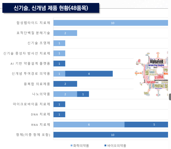 이어 합성펩타이드치료제가 화학의약품 10품목, 항체(이중 항체 포함)가 바이오의약품 10품목으로 그 뒤를 따랐다.