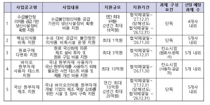 ▲생산시설·장비 확충 ▲원료 구매 다변화 ▲핵심 의약품 비축 ▲바이오 원부자재 사용자 테스트 ▲국산 원부자재 제조 지원 등 공급망 전 주기를 포괄한다.