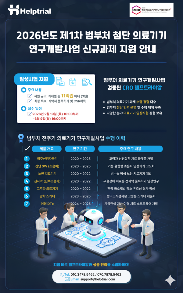 의료기기 임상시험수탁기관(CRO) 주식회사 헬프트라이알(대표이사 정영호)이 '2026년도 제1차 범부처 첨단 의료기기 연구개발사업'의 국내 임상시험 지원 분야에 참여하는 기업을 대상으로 전문 기술 지원 서비스를 제공한다고 밝혔다.
